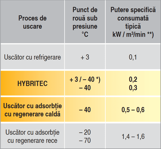 Este important să se utilizeze tehnologii eficiente energetic în special pentru a atinge puncte de rouă sub presiune negative, deoarece uscătoarele cu adsorbție necesare pentru a atinge acest nivel de performanță au un consum foarte mare de energie.